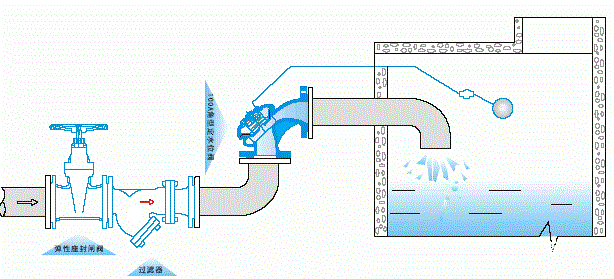 100A角型定水位閥是一種隔膜式調節(jié)水箱和水塔液面高度的閥門。閥門由一特殊強化尼龍膜片將其分為上下兩個腔室,當液面達到設定位置時,浮球導閥關閉,上腔壓力大于下腔,閥門關閉,即停止供水.當液面下降超過預設位置,浮球導閥開啟,上腔壓力小于下腔壓力,閥門開啟.閥門向池內供水。角型定水位閥安裝方便,可省去管道彎頭,節(jié)省安裝空間。該閥保養(yǎng)簡單、靈活耐用、液位控制準確度高,水位不受水壓干擾且關閉緊密不漏水,性能可靠、成本低。浮球可隨水池的高度和距離安裝。
