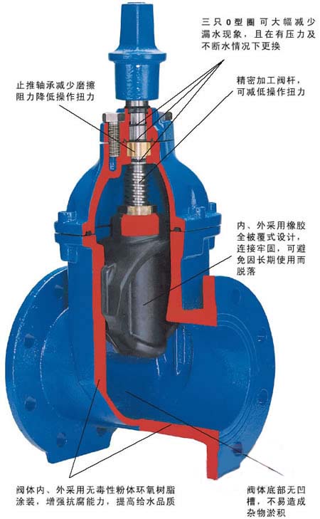 3.可靠的衛(wèi)生性環(huán)氧樹脂符合衛(wèi)生標準GB/T17219-1998,閘板整體包覆符合衛(wèi)生檢驗的橡膠;閥桿、閥桿螺母等零件采用不受水腐蝕的不銹鋼或青銅等到材料。